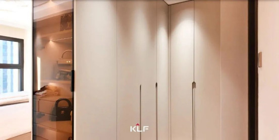 臥室以L形的轉(zhuǎn)角柜做收納和隔斷,合理劃分生活區(qū)域,一半是睡眠的床鋪區(qū)域,一半是步入式衣帽間,提升居住體驗(yàn)。玻璃柜門以展示型收納美學(xué)為核心,融合功能與藝術(shù)的雙重屬性,成為高品位生活的具象化表達(dá)。