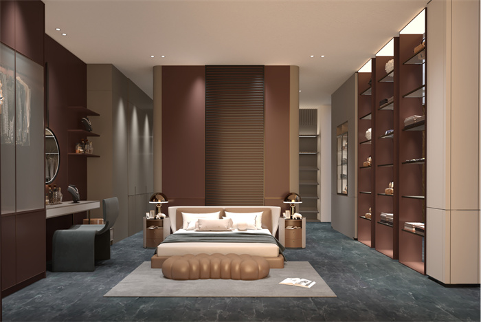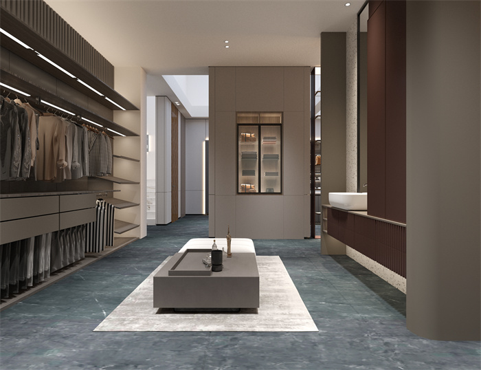 衣帽間的整體設(shè)計(jì)簡(jiǎn)潔明朗,客來(lái)福創(chuàng)新性采用線性的流體意境與交織的“平行線”,讓整個(gè)衣帽間井井有條,大方美觀。生活的高雅追求,在這里體現(xiàn)得淋漓盡致。