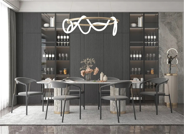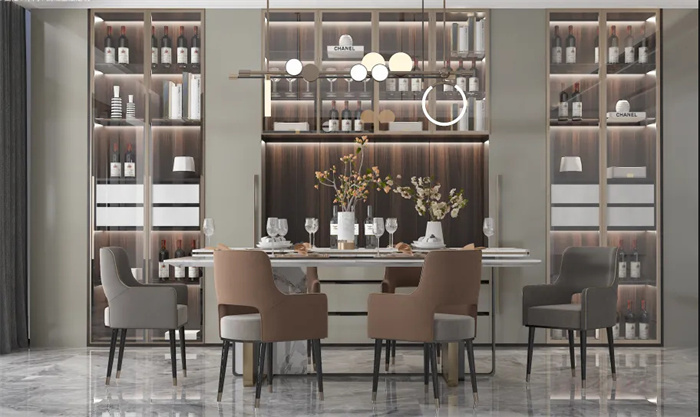 餐邊柜酒柜的組合設(shè)計(jì),增加實(shí)用性的同時(shí)也帶來(lái)了豐富的層次感與趣味性。線條流暢、清晰,金屬與燈光碰撞出精彩的火花,簡(jiǎn)約而精致的設(shè)計(jì)感,在現(xiàn)代造型中顯得十分高貴。