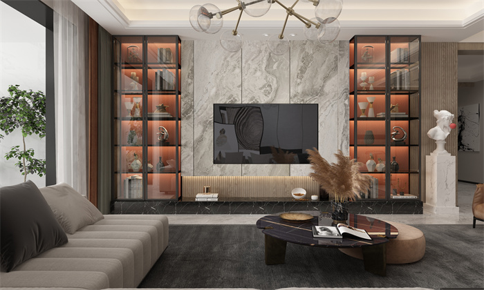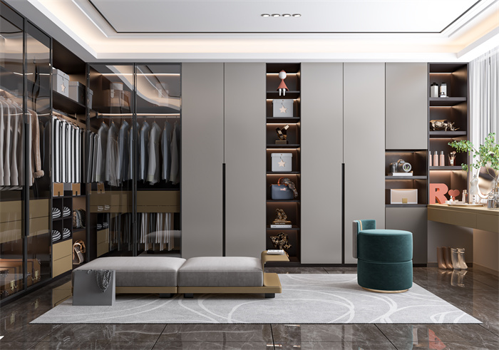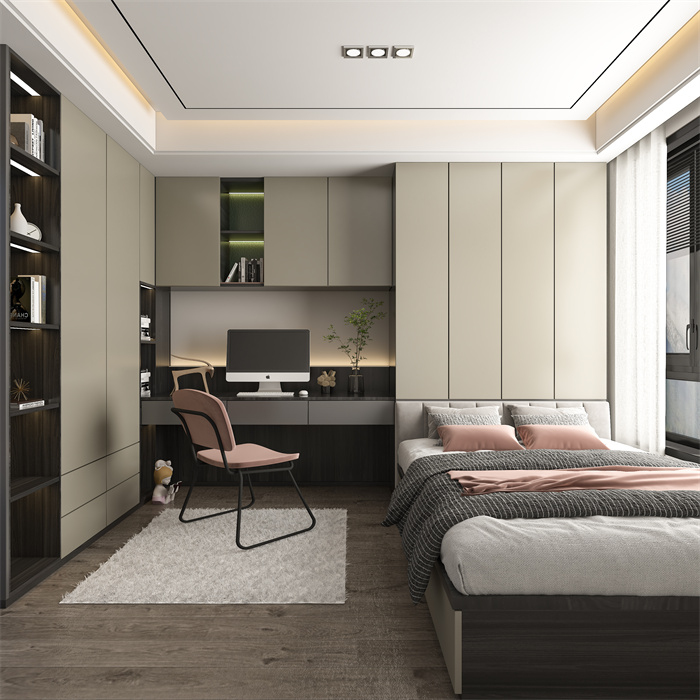 像電視柜的整體抬高設(shè)計,讓業(yè)主在家即能舒適看??;無把手柜門設(shè)計,簡潔利落,增強視覺美感;衣柜的升降拉桿設(shè)計,滿足家庭不同成員的需求。