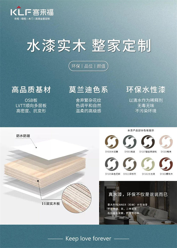 客來福產(chǎn)品全部符合國標(biāo),針對水漆產(chǎn)品也有了多款裝修案例。如:莫蘭迪色系+水漆工藝的意式輕奢風(fēng):墨奈系列,中國紅+水漆工藝的新中式混搭風(fēng):天琛系列,克萊因藍(lán)+水漆工藝的新中式混搭風(fēng):革物·KOLON卡倫系列(9月5日揭曉),但無論是哪一款,都有觸人心弦的魅力。