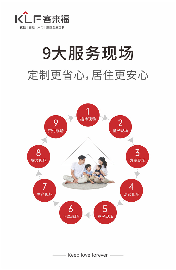 此外,客來福還以接待,量尺,方案,洽談,復尺,下單,生產(chǎn),安裝,交付九大服務現(xiàn)場保障廣大客戶的“幸?!鄙睢?/span>