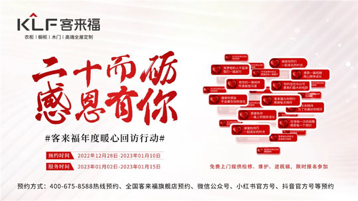 往年,客來福一直堅(jiān)持在新春來臨之際為大家在寒冷冬天送上暖心服務(wù),免費(fèi)為大家上門檢修、維護(hù)、送祝福?,F(xiàn)如今,客來福年度暖心回訪活動正在火熱進(jìn)行中,將以更加熱情和飽滿的精神持續(xù)發(fā)力。“二十而礪,感恩有你”,不論多久、不論多遠(yuǎn),只需一個預(yù)約。