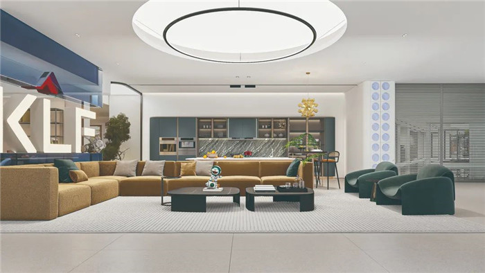 客廳采用藍(lán)色亞克力漸變?cè)O(shè)計(jì),同時(shí)做了品牌Logo的結(jié)合,既作為隔斷之用,也承載著品牌IP和視覺(jué)的傳達(dá)。