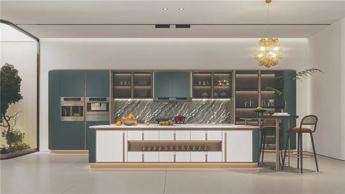 作為社交型廚房的核心區(qū)域——島臺(tái)的設(shè)置,既滿足了日常的備餐功能,也是對(duì)社交功能的拓寬。從烹飪場(chǎng)所升級(jí)到社交場(chǎng)所,空間的連接,亦是情感的橋梁,升華家的溫度,豐盈家的想象。