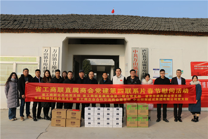 1月10日下午,省工商聯(lián)會員處黨支部、直屬商會黨建第四聯(lián)系片有關(guān)商會黨支部及會員企業(yè)黨支部代表赴廬江縣萬山鎮(zhèn)廿埠村開展走訪慰問活動,為廿埠村部分困難黨員、貧困群眾送去慰問金及大米、食用油、牛奶等生活物品。