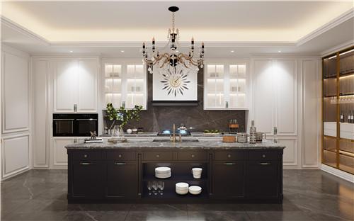 石英石臺(tái)面的中島臺(tái)一方面起到了增加廚房操作臺(tái)的功能,提高了生活的舒適度,另一方面可以充當(dāng)餐桌,偶爾約上三五好友在這里喝酒或者聊天非常愜意。