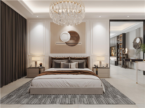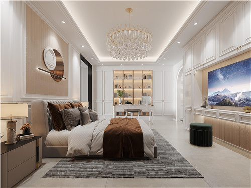 臥室燈具選用法式水晶吊燈為主燈,搭配床頭射燈,流露出少有的輕奢唯美之感。床頭背景墻面運(yùn)用石膏線裝飾出畫框感,現(xiàn)代金屬壁掛與之融合,是屬于你的私享空間。整體設(shè)計(jì)有效增加空間柔和感,典雅而不失溫馨,讓你快速進(jìn)入夢(mèng)鄉(xiāng)。