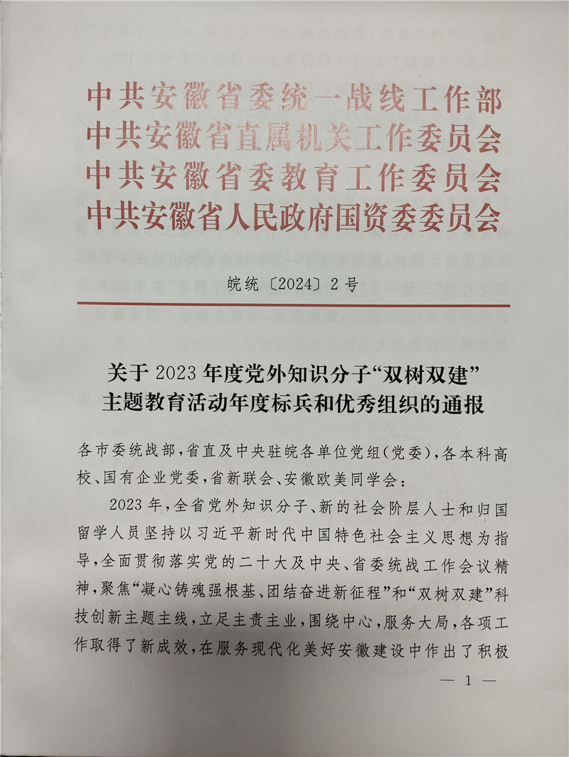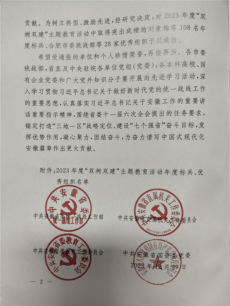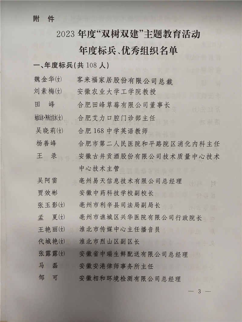 為樹立典型、激勵先進,經(jīng)研究決定,對 2023 年度“雙樹雙建”主題教育活動中取得突出成績的108 名年度標(biāo)兵、合肥市委統(tǒng)戰(zhàn)部等 28 家優(yōu)秀組織予以通報??蛠砀<揖涌偛梦航鹑A女士獲得年度標(biāo)兵榮譽。