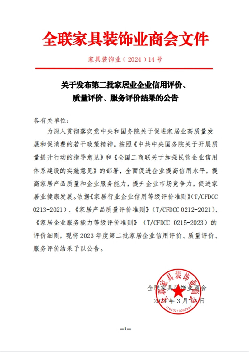 為深入貫徹落實(shí)黨中央和國務(wù)院關(guān)于促進(jìn)家居業(yè)高質(zhì)量發(fā)展和促消費(fèi)的若干政策精神,按照《中共中央國務(wù)院關(guān)于開展質(zhì)量提升行動的指導(dǎo)意見》和《全國工商聯(lián)關(guān)于加強(qiáng)民營企業(yè)信用體系建設(shè)的實(shí)施意見》的部署,全面促進(jìn)企業(yè)提高信用水平,提高家居產(chǎn)品質(zhì)量和企業(yè)服務(wù)能力,提升企業(yè)市場競爭力,促進(jìn)家居業(yè)健康發(fā)展。依據(jù)《家居行業(yè)企業(yè)信用等級評價準(zhǔn)則》(T/CFDCC0213-2021)、《家居產(chǎn)品質(zhì)量評價準(zhǔn)則》(T/CFDCC 0212-2021)、《家居企業(yè)服務(wù)能力等級評價準(zhǔn)則》(T/CFDCC 0215-2023)的評價細(xì)則,全聯(lián)家具裝飾業(yè)商會公布2023 年度第二批家居企業(yè)信用評價、質(zhì)量評價、服務(wù)評價結(jié)果,客來福家居評獲定制家居行業(yè)信用評價5A、產(chǎn)品質(zhì)量評價5星、服務(wù)能力評價5星榮譽(yù)。