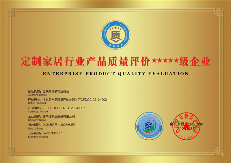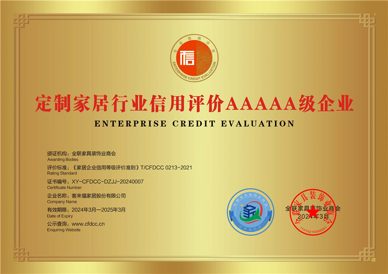 祝賀!客來福評獲定制家居行業(yè)信用評價5A、產(chǎn)品質(zhì)量評價5星、服務(wù)能力評價5星榮譽(yù)