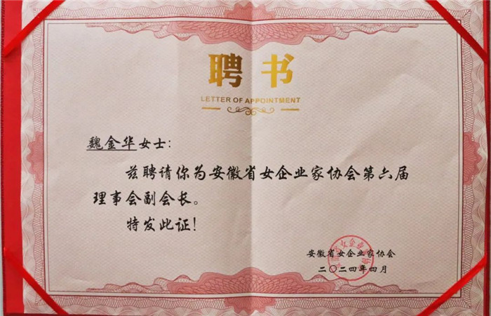 經(jīng)過篩查與素質(zhì)的綜合評定,客來福智能科技股份有限公司總裁魏金華被聘請為安徽省女企業(yè)家協(xié)會第六屆副會長,體現(xiàn)了協(xié)會對魏金華女士工作的認(rèn)可,這不僅是一份榮譽(yù),更是一份激勵。