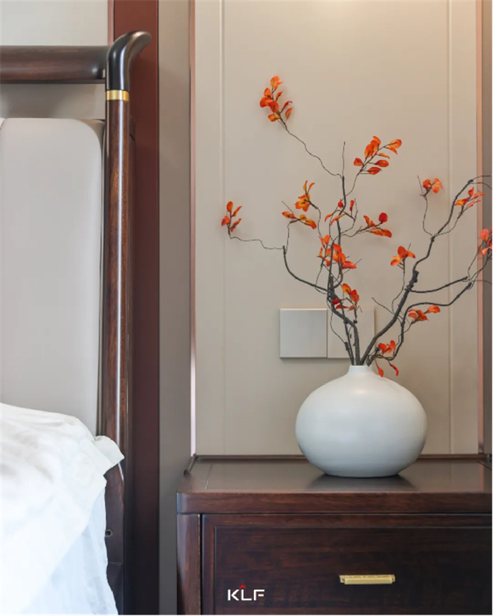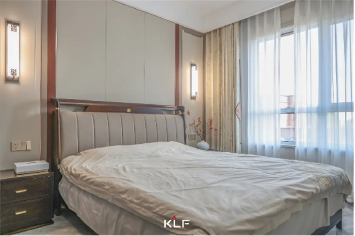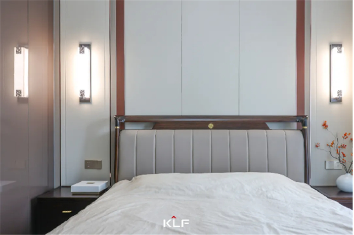 新中式床頭背景墻,勾勒出一個寧靜悠遠(yuǎn)的意境,搭配色調(diào)淡雅的復(fù)古燈具,方寸之間皆是風(fēng)雅韻味。