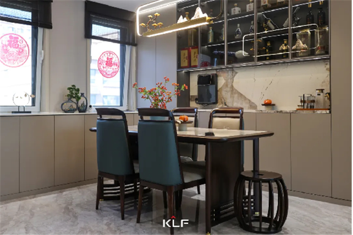 開放式餐廳設(shè)計,大氣餐邊柜玻璃柜門與開放格,超強(qiáng)的儲物空間加上燈帶的加持,頗有意境和空間感。