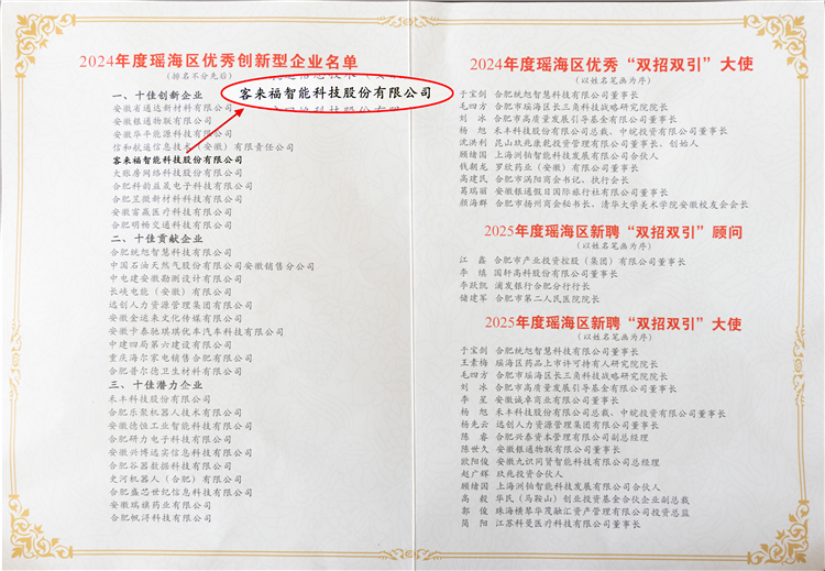 2月13日,2025年瑤海區(qū)縱深推進(jìn)“三大行動(dòng)”加快發(fā)展新質(zhì)生產(chǎn)力大會(huì)隆重召開。會(huì)上,安徽客來福智能科技股份有限公司憑借卓越的創(chuàng)新能力與突出貢獻(xiàn),榮膺2024年度“瑤海區(qū)優(yōu)秀創(chuàng)新型企業(yè)”殊榮。
