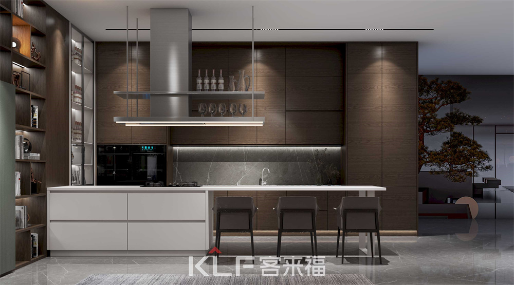 餐廳區(qū)域采用一字型櫥柜和導(dǎo)臺(tái)相結(jié)合,深色和淺色想搭配的設(shè)計(jì),讓廚房更顯活躍,依靠新材料、新的科技元素加上光與影的?窮變化,追求無(wú)常規(guī)的空間解構(gòu),大膽運(yùn)用對(duì)比鮮明的色彩,以及搭配剛?cè)岵?jì)的選材,這便是現(xiàn)代極簡(jiǎn)風(fēng)格廚房。