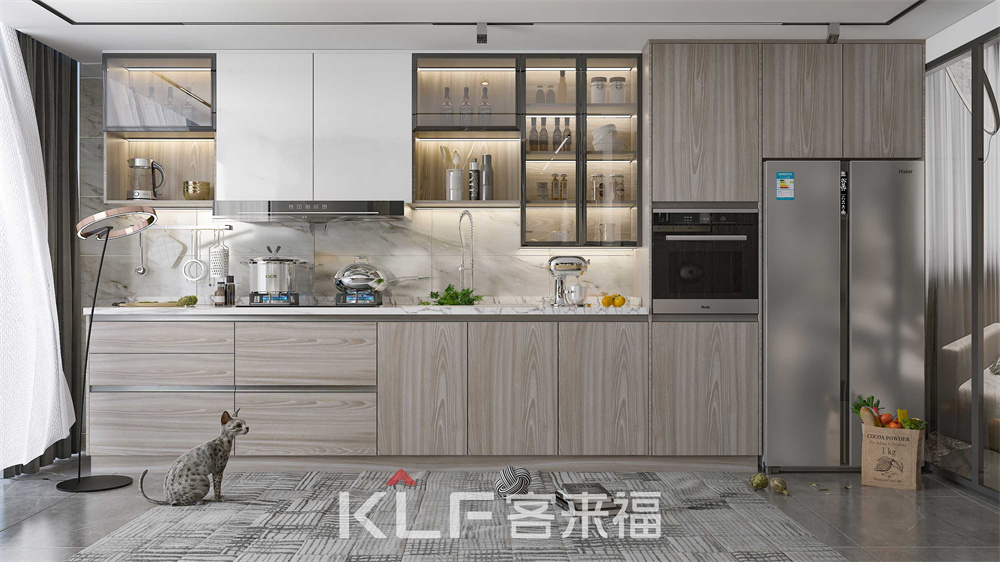 一字型排開構(gòu)造,動線合理,素雅白+原木色搭配金屬元素和鋼化玻璃,打造溫馨舒適的空間環(huán)境,嵌入式冰箱和烤箱設(shè)計,與櫥柜融為一體愈顯大氣、簡約。