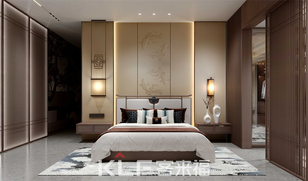 新中式臥室,整體高大整齊,外觀簡單無復雜線條。兩側對稱床頭柜,兼?zhèn)湫揎椗c臨時存放功能,搭配低飽和度燈光,營造適眠環(huán)境,保障家庭成員的睡眠質量。