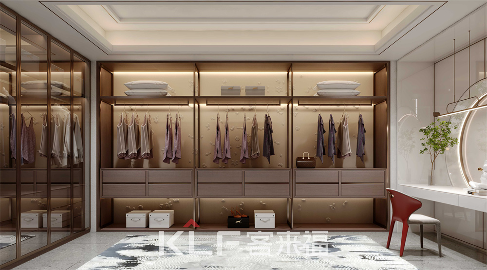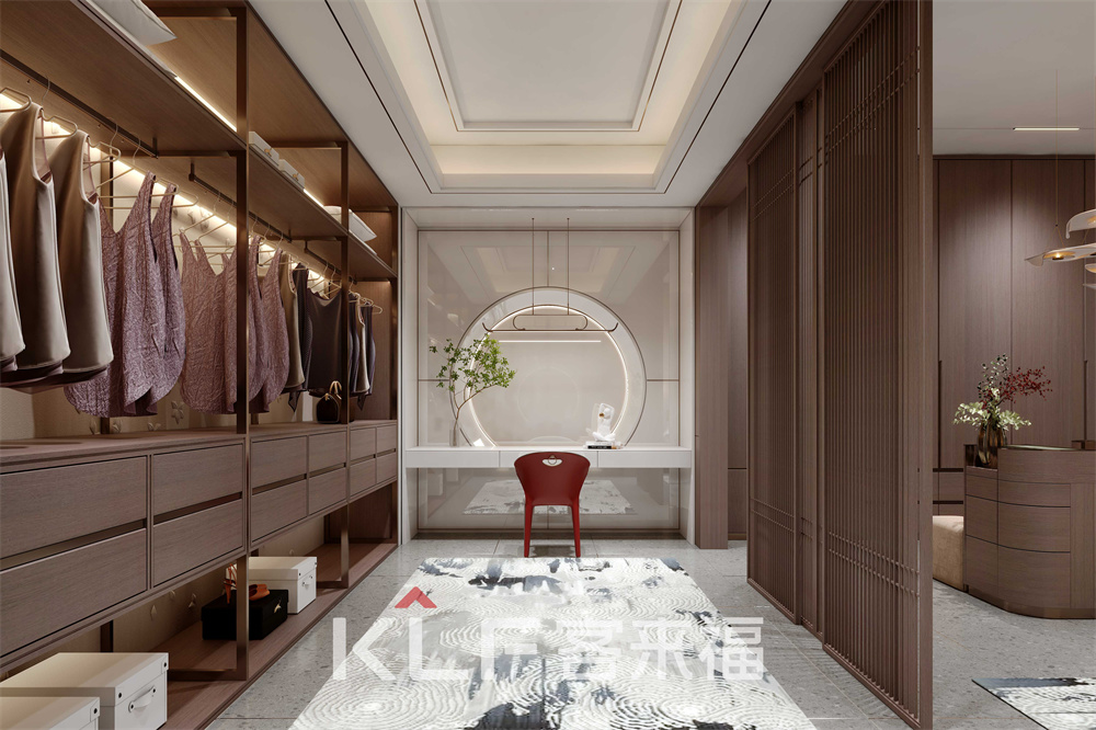 新中式開放式衣帽間,以屏風分隔其他空間,打造出一塊相對的獨立區(qū)域。背板運用皮雕工藝,鋁木型材框架搭配實木材質,布局主要存儲區(qū)。底部掏空,增強衣帽間的靈活性,中下部安裝推彈軌道抽屜,觸摸即可抽拉。