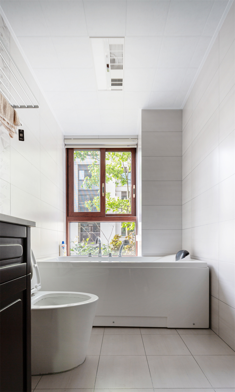 浴室中依舊是中雅胡桃色的窗戶邊框。白色給人的感覺(jué)非常干凈利落,在窗戶頂做了抽拉式百葉窗的設(shè)計(jì),便于在洗漱時(shí)窗簾的拉起和放下,手動(dòng)的也更能增加體驗(yàn)的感覺(jué)。