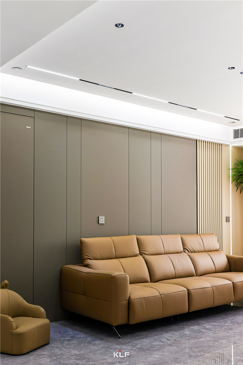 在柜體設(shè)計(jì)上想要傳遞出輕奢理念,除了暗藏?zé)魩У某R?guī)操作,可以在色彩搭配上與材質(zhì)上入手。例如案例中多處采用半透茶色彩玻作為柜門點(diǎn)綴使用,既增添了空間的通透感呼吸感,也讓整體帶有“都市輕奢”的意蘊(yùn)。