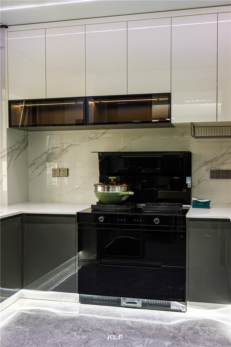 廚房采用U型布局,灰白兩色搭配簡(jiǎn)單干凈。餐邊柜的設(shè)計(jì)遵循“二八原則”,小面積展示+大空間儲(chǔ)物,可以讓家居用品都有序擱置,不凌亂的家,才更美好。柜體采用PET門板,光澤度好,搭配半透茶色玻璃柜門,通透又優(yōu)雅。