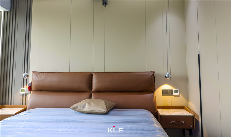 例如在過道處的格柵護(hù)墻板采用了客來?!け逃竦念伾?,清新自然,凸顯質(zhì)感。而在臥室中則采用了更為深沉的灰色系不規(guī)則格柵墻板,營(yíng)造平靜高級(jí)的家居氛圍。