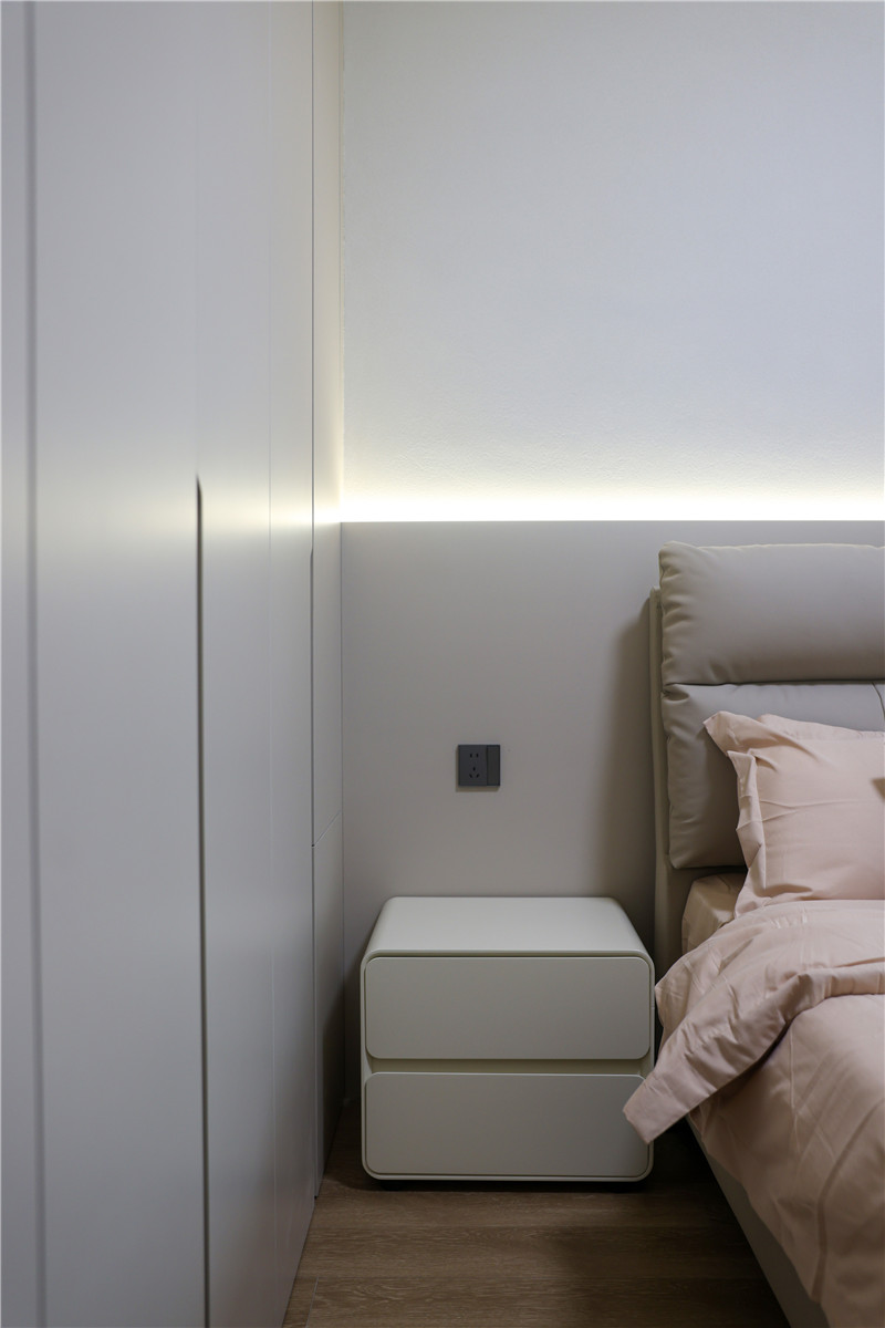 以實用為主要需求的臥室設(shè)計:簡約的配色與簡單的衣柜設(shè)計,一柜到頂式增加儲物能力、半銑j型拉手簡潔實用,其中跳色粉套格設(shè)計既時尚又具有一番創(chuàng)意,為舒適的空間帶去一絲趣味。