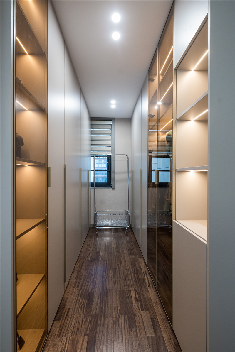 臥室側(cè)邊建立小型衣帽間,II型構(gòu)造有效利用狹長區(qū)域,木柜、玻璃柜、展示柜組合,以藏八露二原則展現(xiàn)美感,其柜金屬色長短拉手配合,好看且具備實用性。