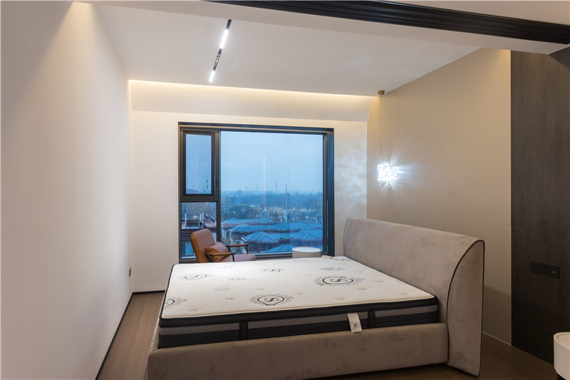 主臥床頭背景墻采用拼接設(shè)計(jì),藝術(shù)燈光做點(diǎn)綴,營(yíng)造出簡(jiǎn)約純粹感;靠窗吊頂為斜坡設(shè)計(jì),視覺上拔高層高。