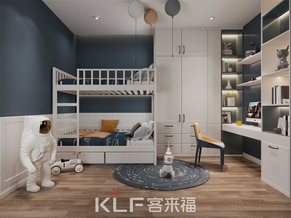 兒童房空間延伸了設計的色彩主題,不同飽和度的藍色配合深邃的星空藍,冷靜并充滿思考,L形的設計也被充分利用。