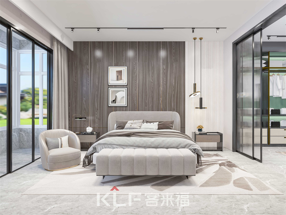 臥室多使用深色系列,創(chuàng)造色彩差異,右側(cè)柵格的黑橘兩色,搭配輕奢風(fēng)的華貴與簡(jiǎn)約低調(diào)碰撞出火花,每一處都擊中時(shí)尚潮流范。