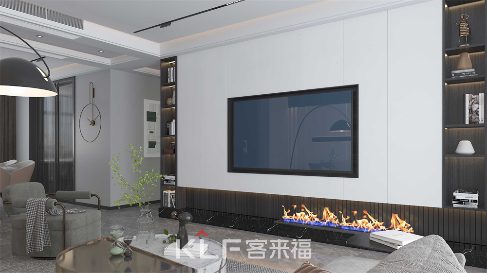 電視墻雖簡約質(zhì)樸,但也正因如此給整個客廳渲染出高端大氣的氛圍。兩邊的墻柜增加收納的功能,底部的火爐效果給空間帶去一絲生機活躍之感。